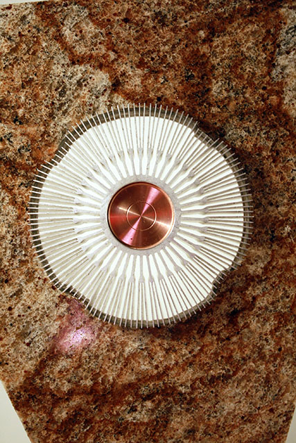 This piece is made entirely from "found objects." The granite was rescued from the discard pile behind a granite countertop fabricator's shop; the inlaid heat sink was from a discarded pentium computer. The voids in the heat sink allow incident light to pass through the tilted granite illuminating the space behind the sculpture.