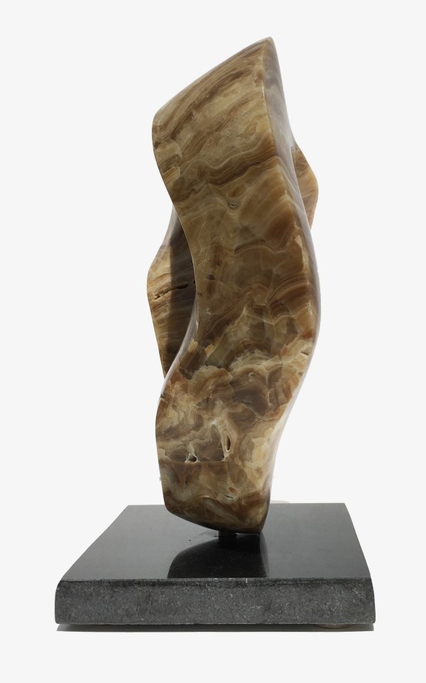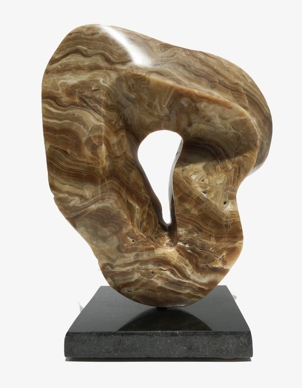 This piece was carved from the same onyx block that I carved "A Void Dance" from. This time I simply ignored the voids and focused on carving a Möbius "strip". The beautiful and complex coloring of this stone adds so much to this carving