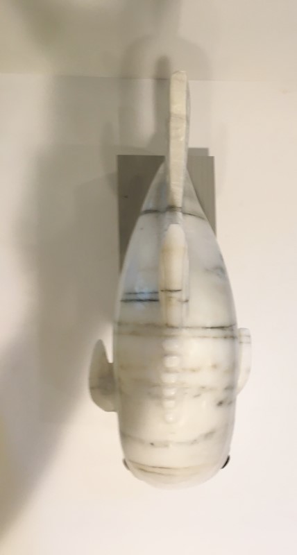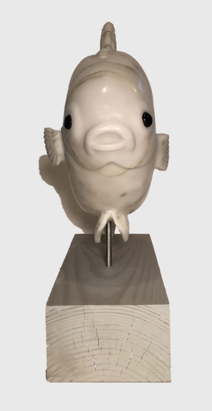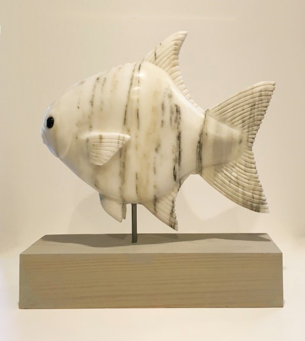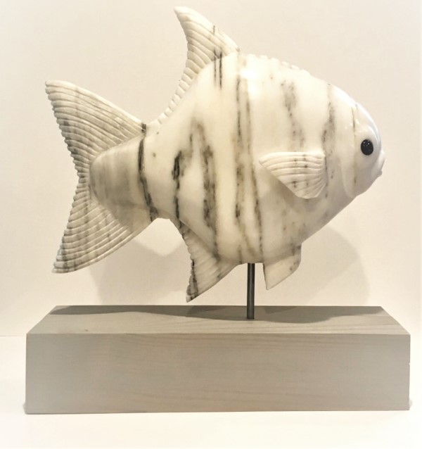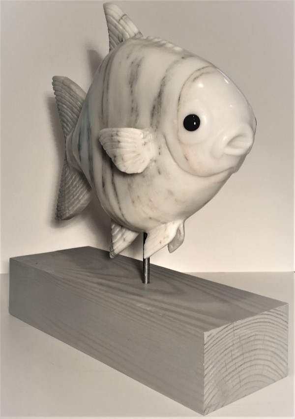 This is the sixth fish carving in the series. It was a piece commissioned by a collector of my work who enjoys fishing for pompano. The distinctive shape of this species coupled with its reputation as the world's most edible fish made this an enjoyable endeavor. This is the first of my fish carvings in which both pectoral fins extend out from the body. My enthusiasm for carving it is reflective in the distinctive personality.