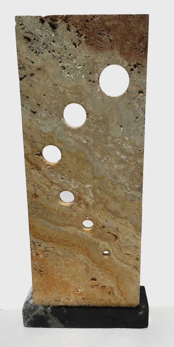 This is the fifth in the "Whimsical Geometrics" series. Distinguishing features of this piece include circular voids rising to the top of the rectangular terracotta slab.
